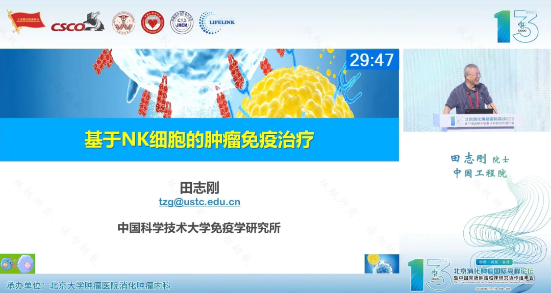 中国科学技术大学免疫学研究所的田志刚院士在第十三届北京消化肿瘤国际高峰论坛上分享了NK细胞疗法的最新成果。