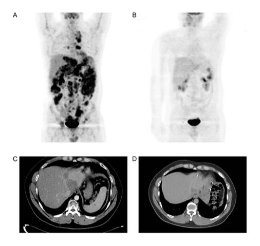 治疗一年后,该患者的肿瘤体积缩小了47%,达到了部分缓解的标准。随后患者接受了减瘤手术和放化疗,病情持续缓解,至今未见复发迹象。
