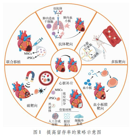 提高细胞留存率 动物实验证实,多种干细胞联合移植、构建心脏补片及增强心脏靶向性(磁靶向、多肽靶向、血小板膜靶向、抗体靶向)等策略可显著提高留存率(见图1)。