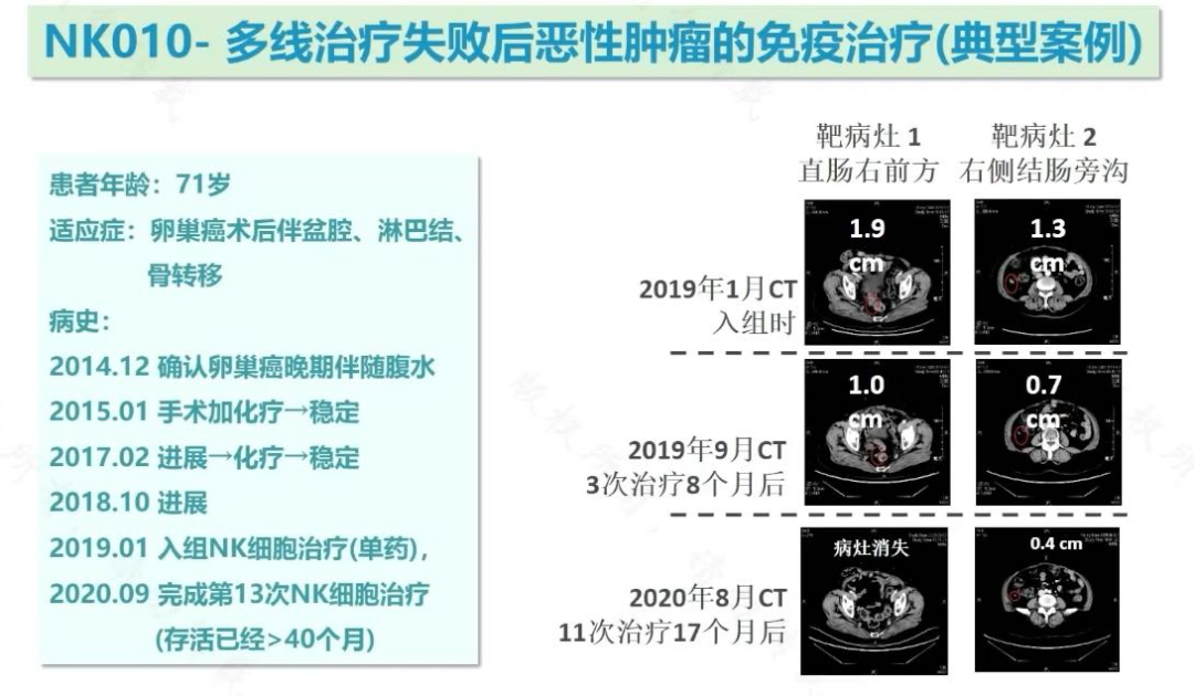 其中一位患者的故事尤为鼓舞人心。该患者于2014年确诊晚期卵巢癌,历经手术、化疗,病情仍不断进展。2019年入组NK细胞治疗临床研究时,体内已有多个转移病灶。经过13次NK细胞治疗,截至2020年9月,患者已存活超过40个月,且影像学检查显示病灶明显缩小甚至消失。