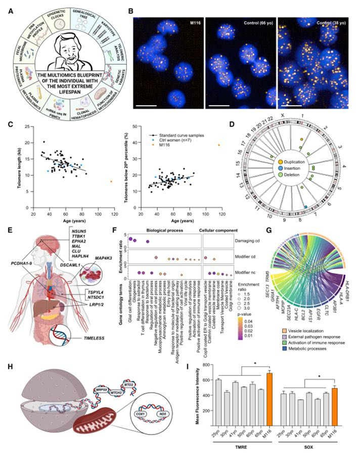 研究人员通过基因组、转录组、代谢组、蛋白质组、微生物组和表观基因组等多维度分析,深入剖析了这位117岁老人的分子特征,并将其与普通人群进行了对比。
